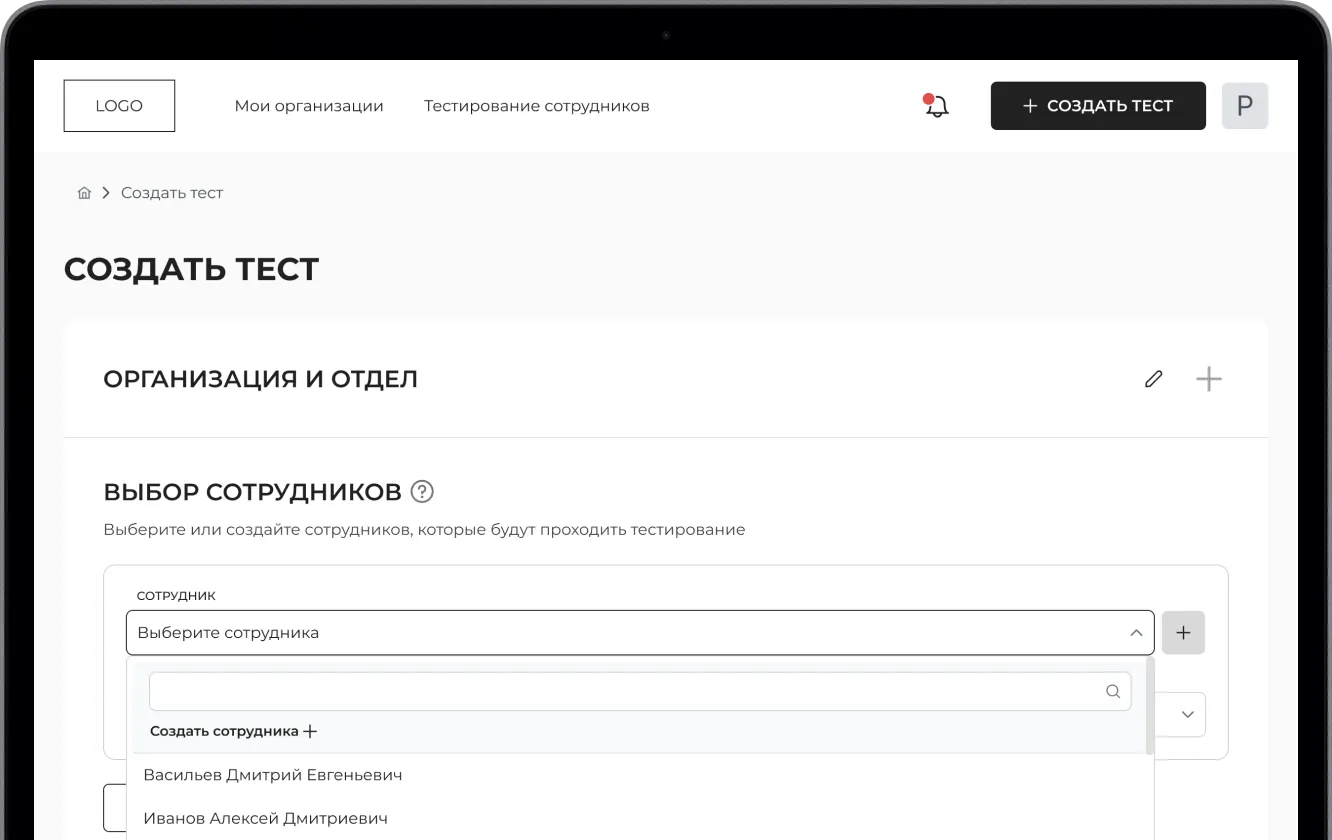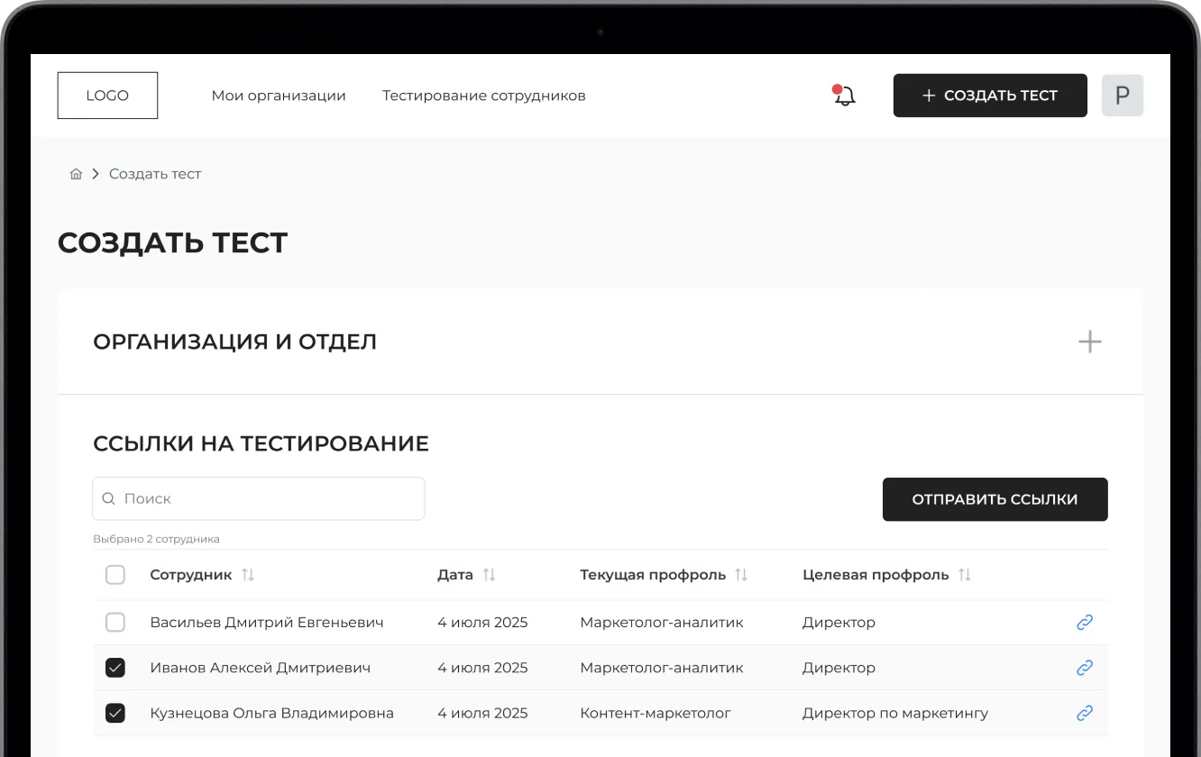 Настройте тест для группы или отдельного сотрудника/кандидата и выберите профроли, по которым система проведёт оценку — например, чтобы понять потенциал на руководящую должность