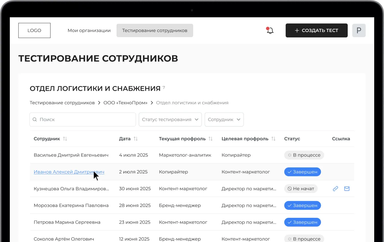 В личном кабинете отображается статус прохождения теста. Вы сразу видите, кто уже завершил оценку, а кто ещё в процессе