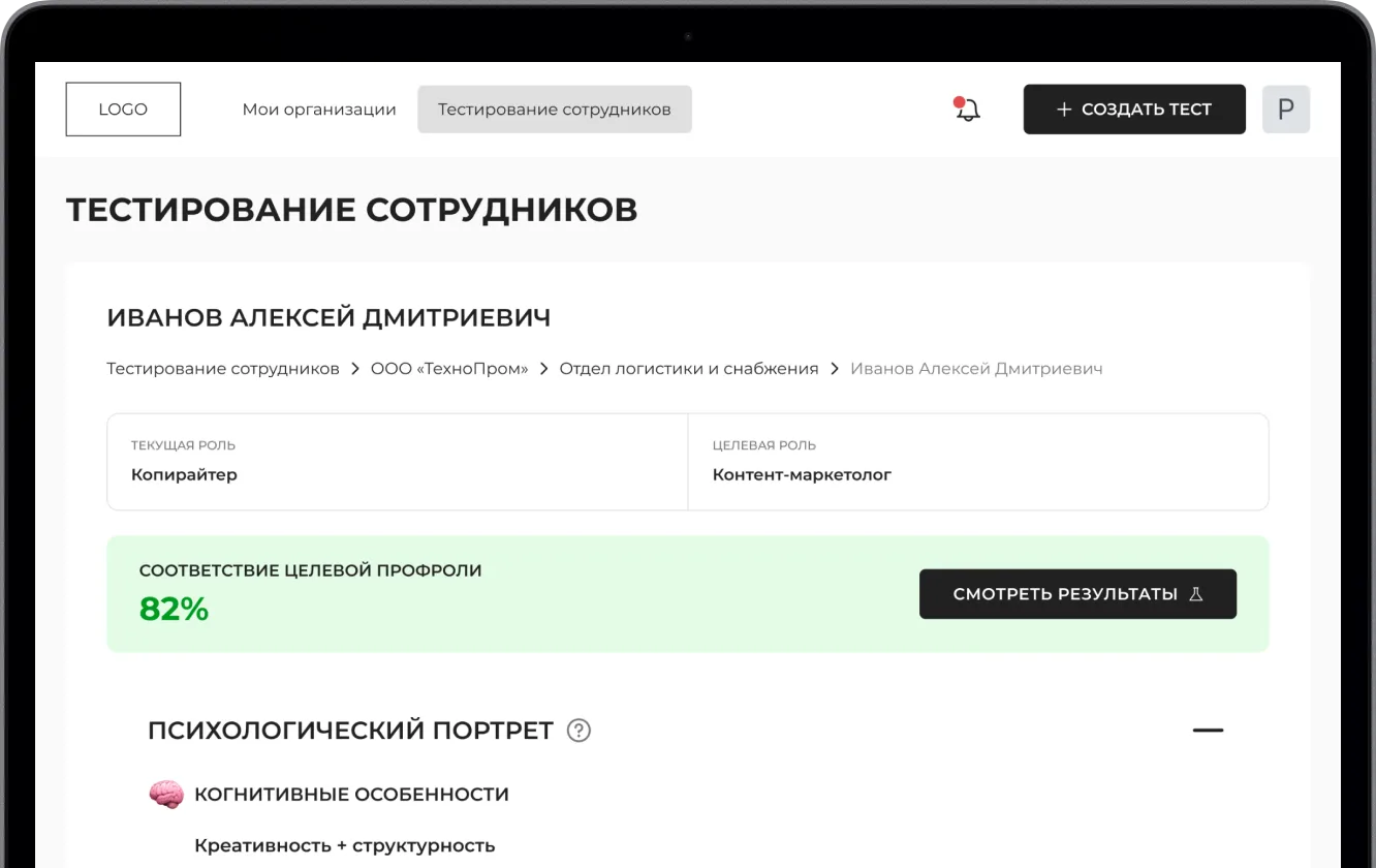 После прохождения теста формируется персонализированный отчёт. В нём — мотивация, сильные стороны и уровень соответствия выбранным профролям и еще много всего полезного для руководителей и сотрудников HR